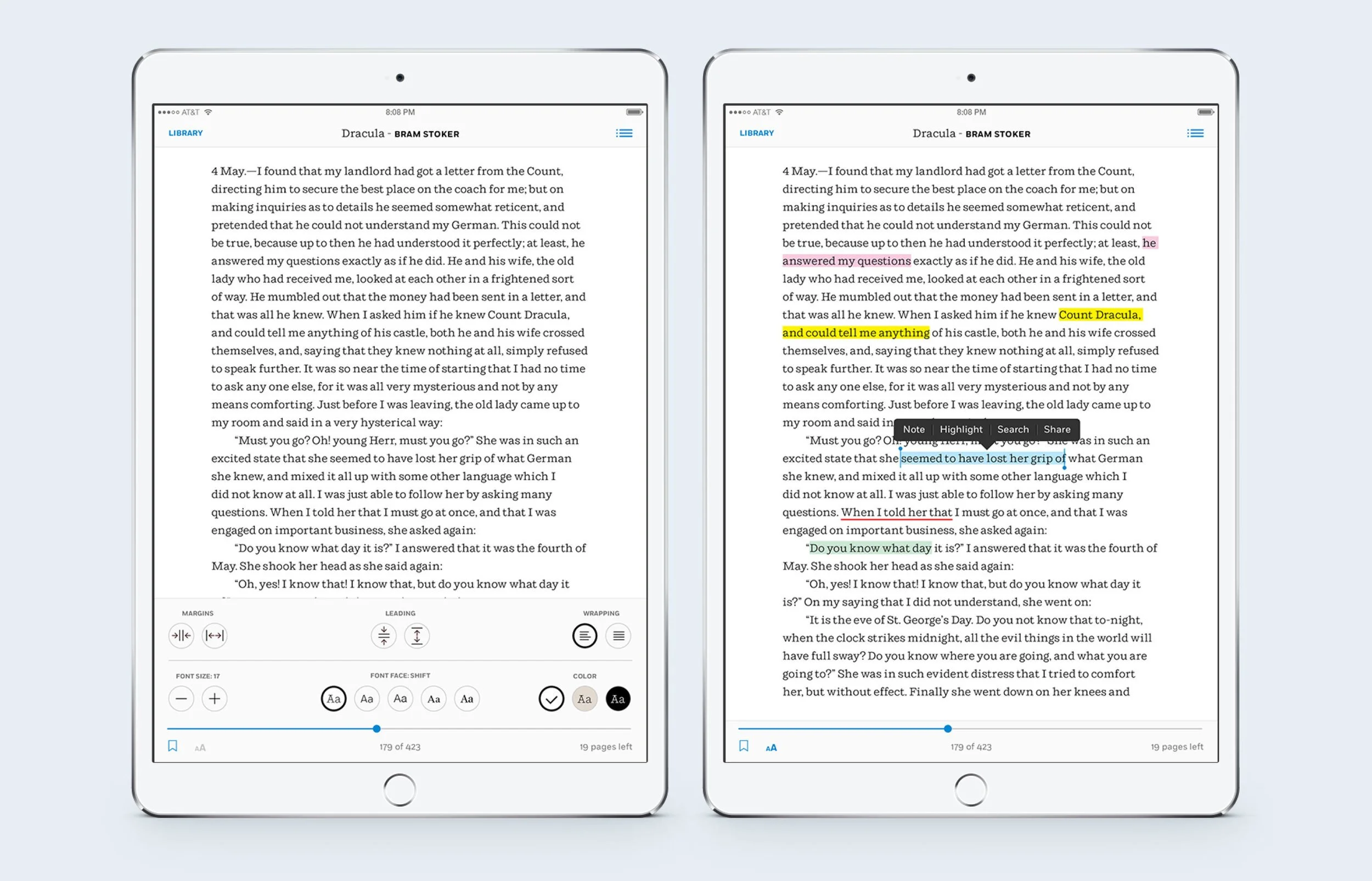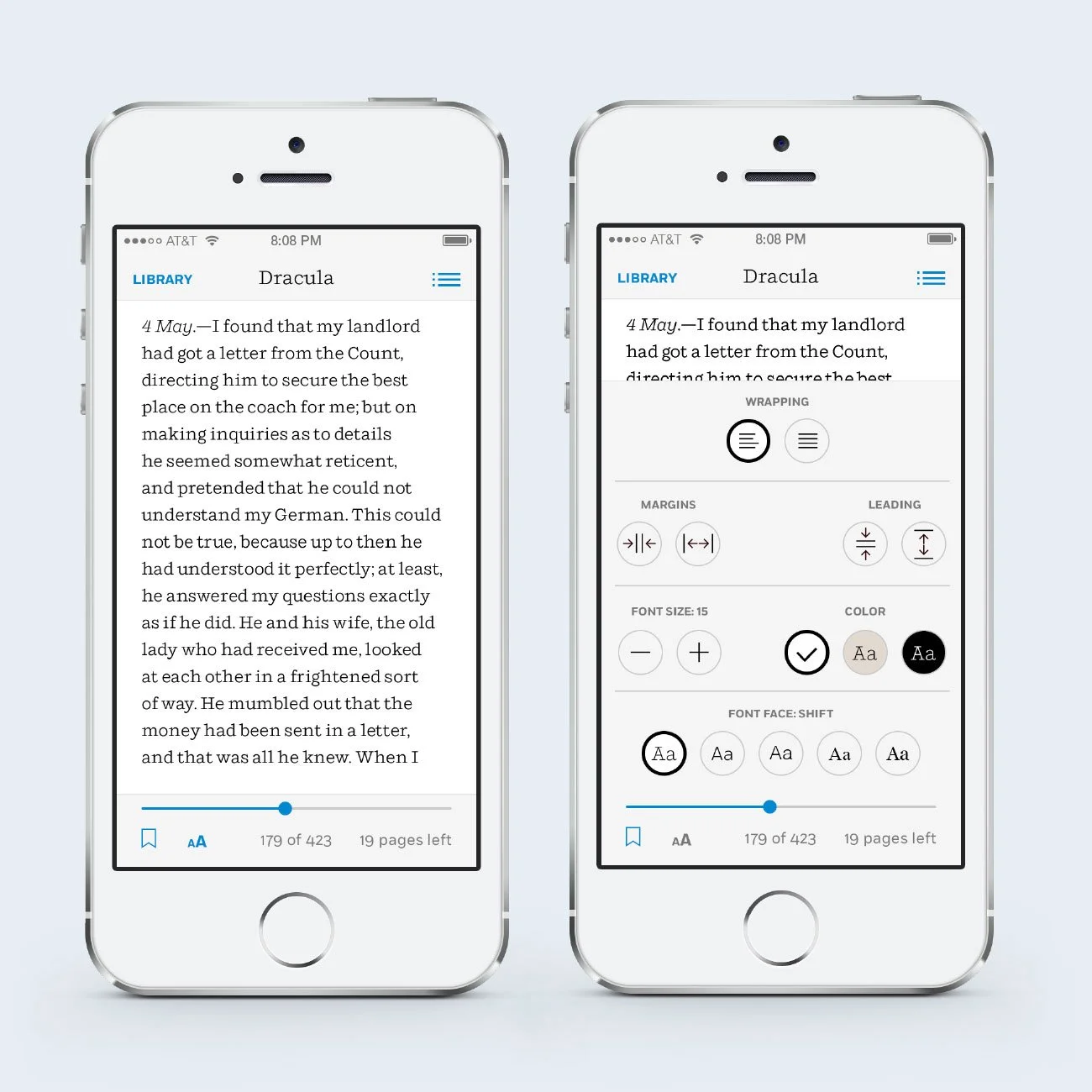 We wanted to ensure a best-in-class reading experience. After surveying the existing landscape of eReaders, and locating gaps we had ourselves experienced, we designed an app with the greatest flexibility possible for optimizing the reading experience.