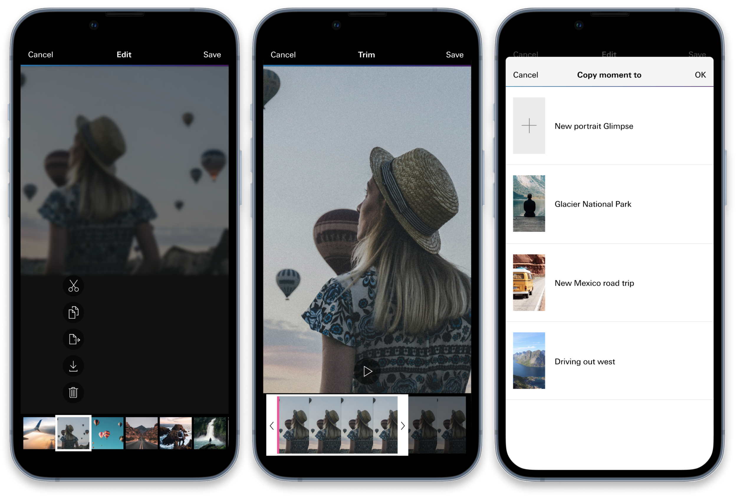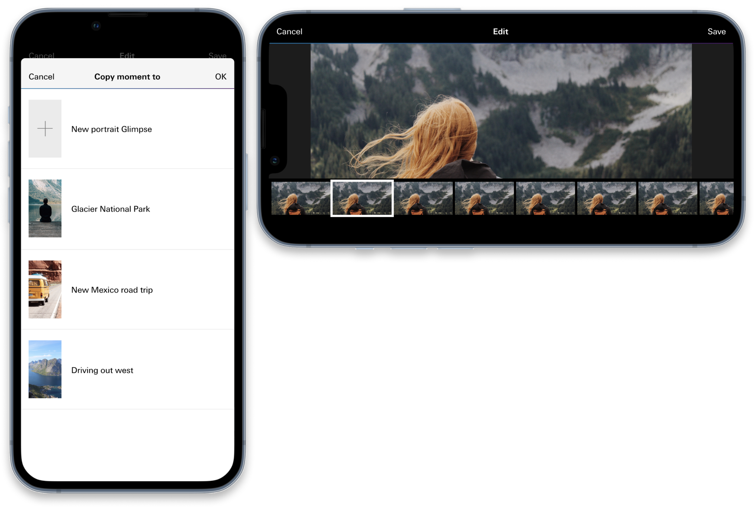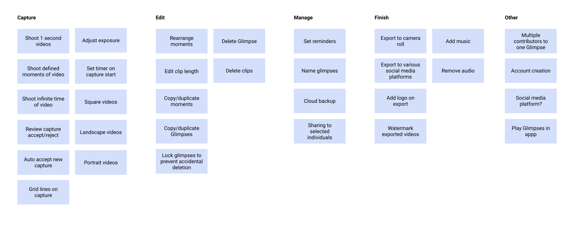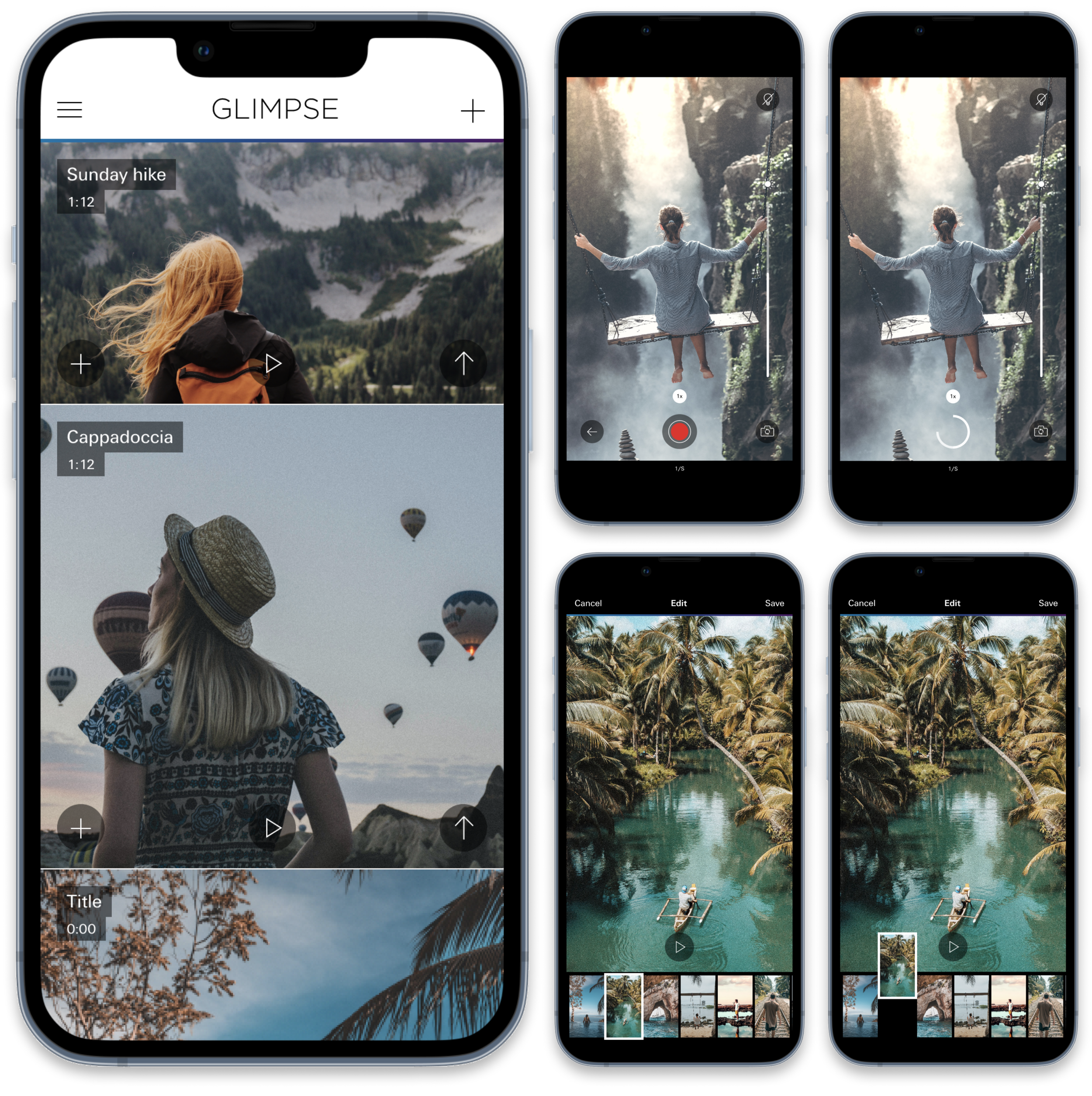 While the MVP let people record one second moments and automatically attach them to an ever-growing Glimpse, the first release added some complexity to the model, including the ability to create multiple Glimpses and name them in the list view, and simple editing that let users delete moments from their Glimpses.